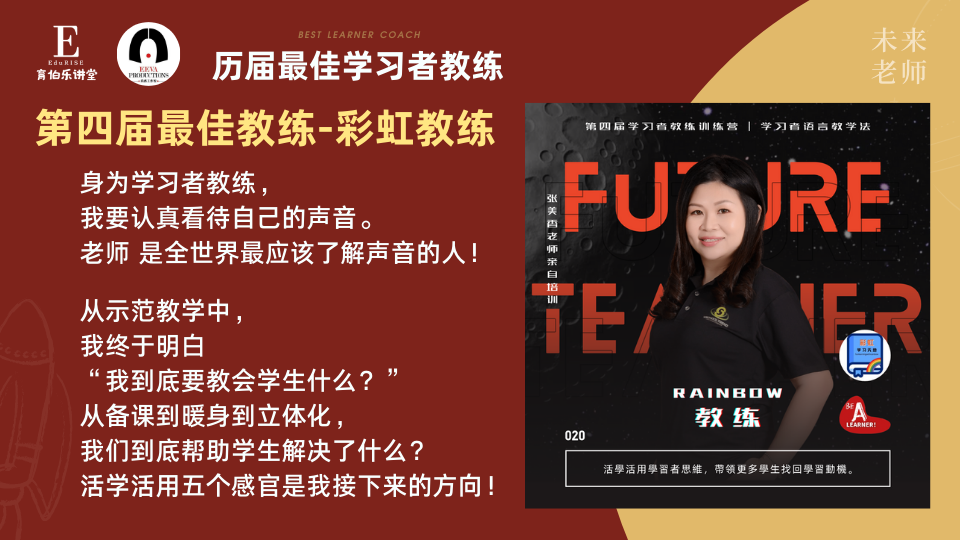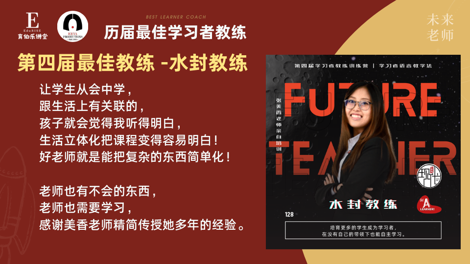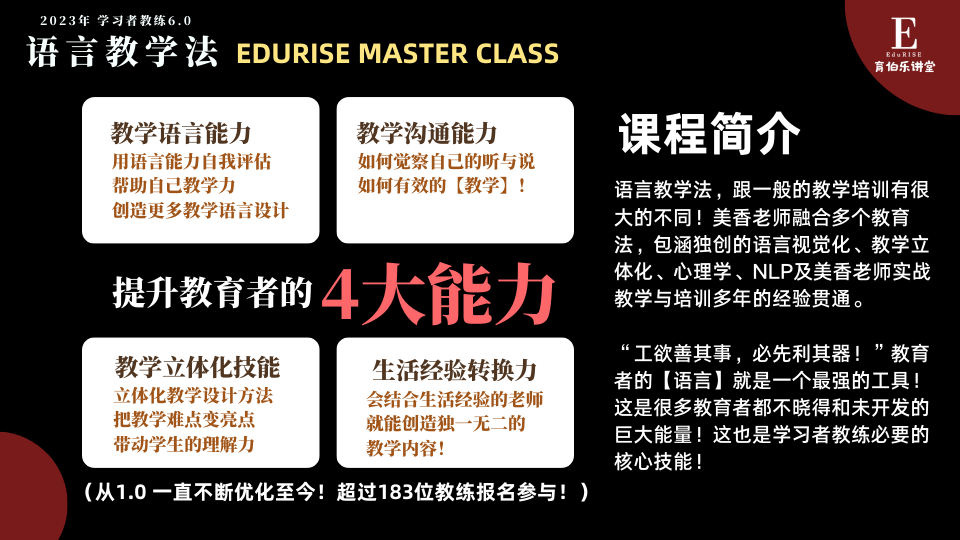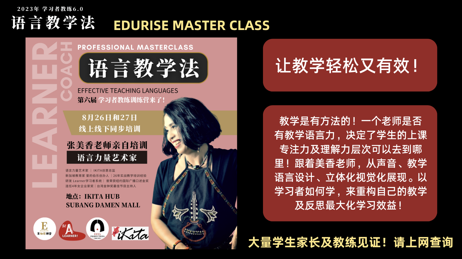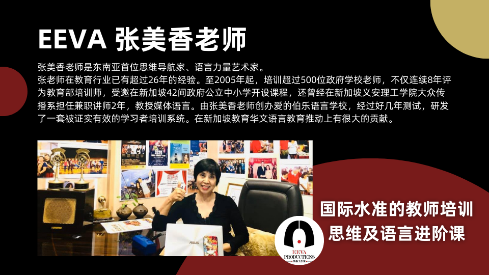 语言教学法是【学习者创新发起人】张美香老师所研究并亲自培训的线上认证课程。张美香老师是东南亚首位思维导航家、语言力量艺术家。张老师在教育行业已有超过26年的经验。至2005年起,培训超过500位政府学校老师,不仅连续8年评为教育部培训师,受邀在新加坡42间政府公立中小学开设课程,还曾经在新加坡义安理工学院大众传播系担任兼职讲师2年,教授媒体语言。由张美香老师创办爱的伯乐语言学校,经过好几年测试,研发了一套被证实有效的学习者培训系统。在新加坡教育华文语言教育推动上有很大的贡献。