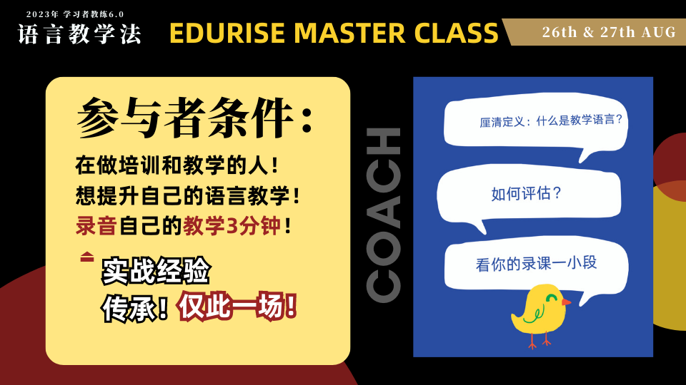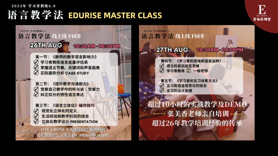 一个有语言力量的教育者,他的教学自然就会引起孩子学习兴趣及专注力。语言不是说话,语言的背后需要有饱满的思想。我们不只是授课传递知识,身为21世纪的教育者,我们更加重视如何激发孩子去思考,如何提问,如何引导。从这个本质上来说,经过培训的教育者,他们更加明白语言的培训是任何关键教学不可或缺的能力。语言教学法培训范围着重在帮助教育者成为一个掌握正确语言表达力的教育者。参与者最后会进行学习评估,通过评估者将会被赠予合格证书。